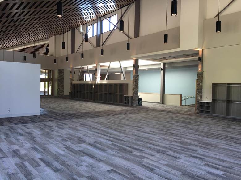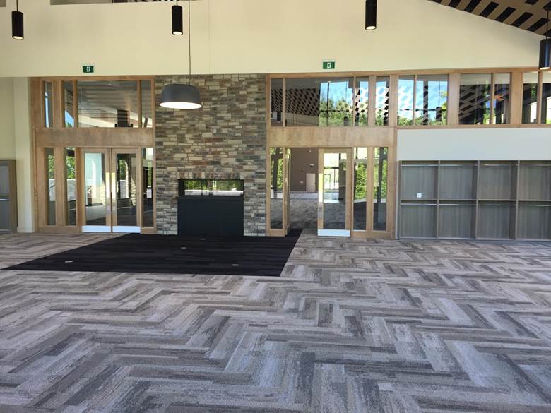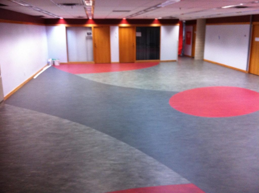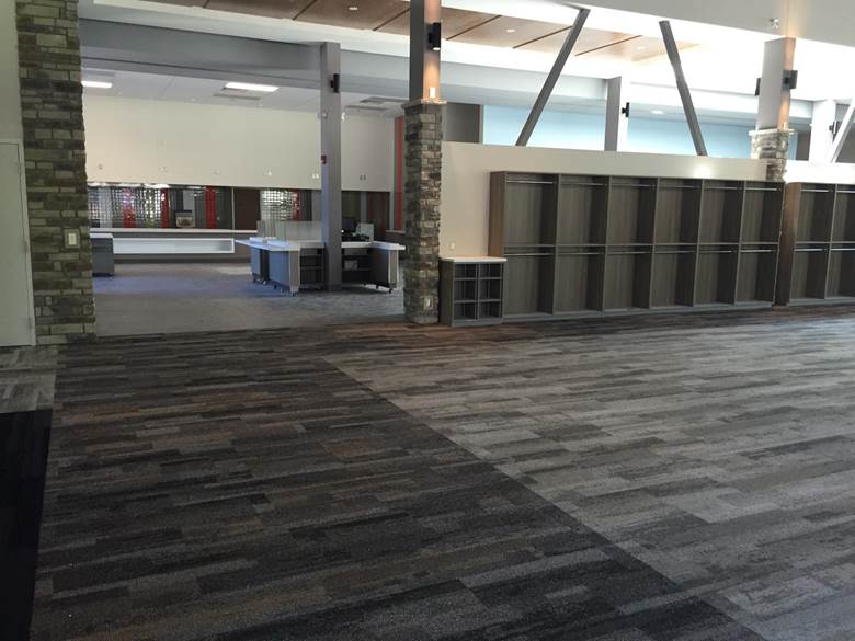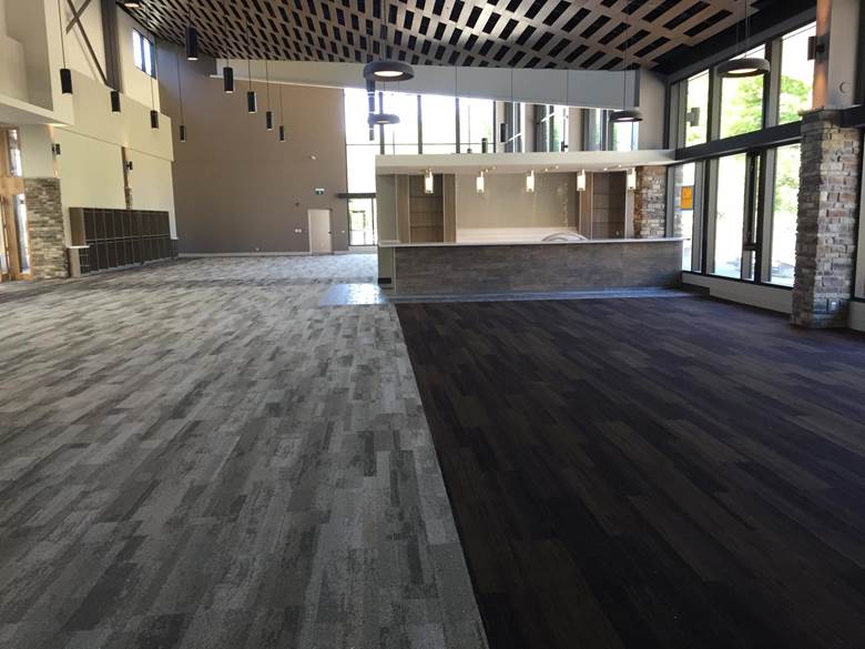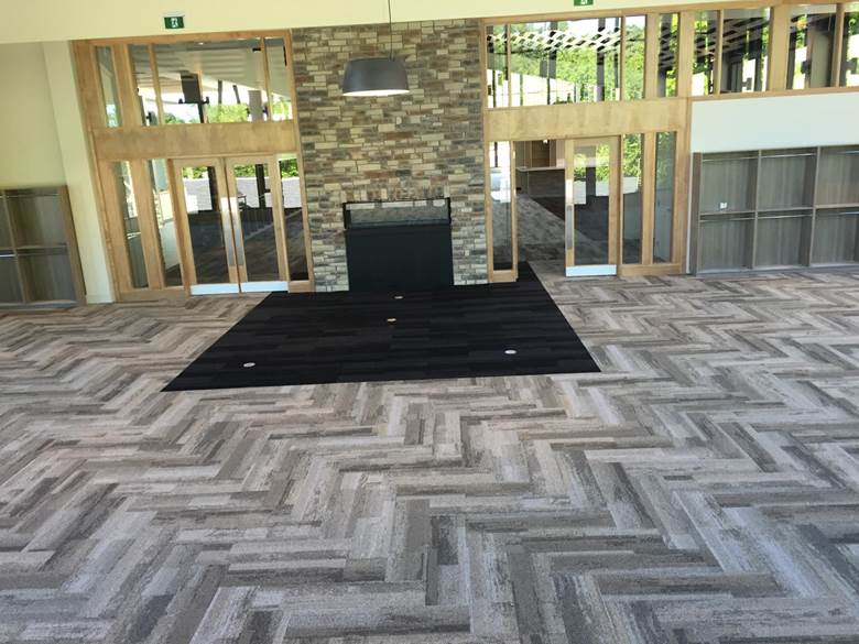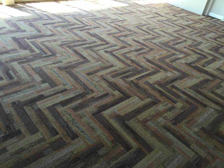 Floor preparation and installation of new carpet tile herringbone pattern including Johnsonite Rubber base